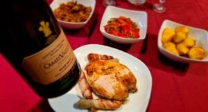 Pairing: Camel Valley Rosé Brut What’s on the plate: Chicken Breast Crown Roast Potatoes Spicy Sprouts Vegetable Medley Yorkshire puds (shop bought) Pork Chipolatas in blanket Optional condiments – gravy ————————————————————————————————– Ingredients for Spicy Sprouts Half a regular sized pack of Brussel Sprouts – halved 1 x small red onion diced and fried Salt Ground…
