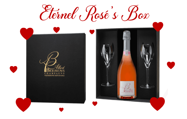 For a romantic tête à tête, we offer you the ideal box, a bottle of our cuvée Éternel Rosé,awith two flutes signed Albert Beerens.